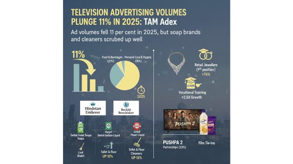Advertising Television advertising volumes plunge 11 per cent in 2025: TAM AdEx India’s television advertising market took a battering in 2025, with ad volumes plummeting 11 per cent compared to the previous year. The decline signals... Indian MediaJanuary 21, 2026