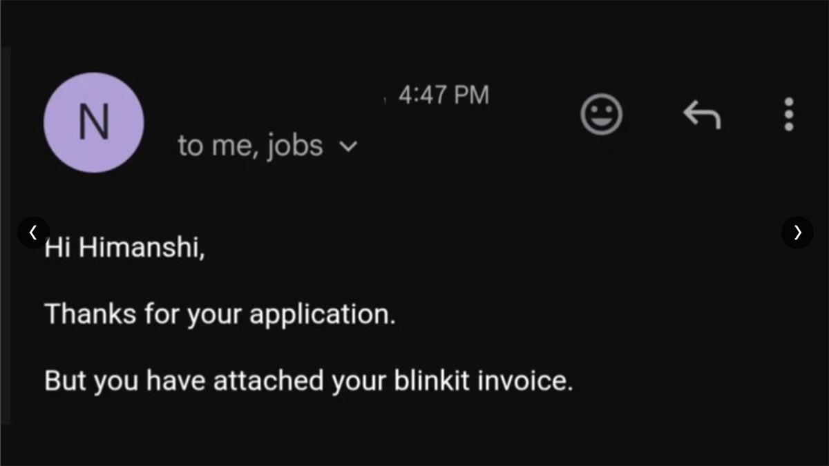DELHI: It began, as most great disasters do, with a single careless click. Himanshi, a journalism and media professional on the job hunt, attached a document to a job application and hit send. The recruiter’s reply arrived promptly: “Hi Himanshi, thanks for your application. But you have attached your Blinkit invoice.”